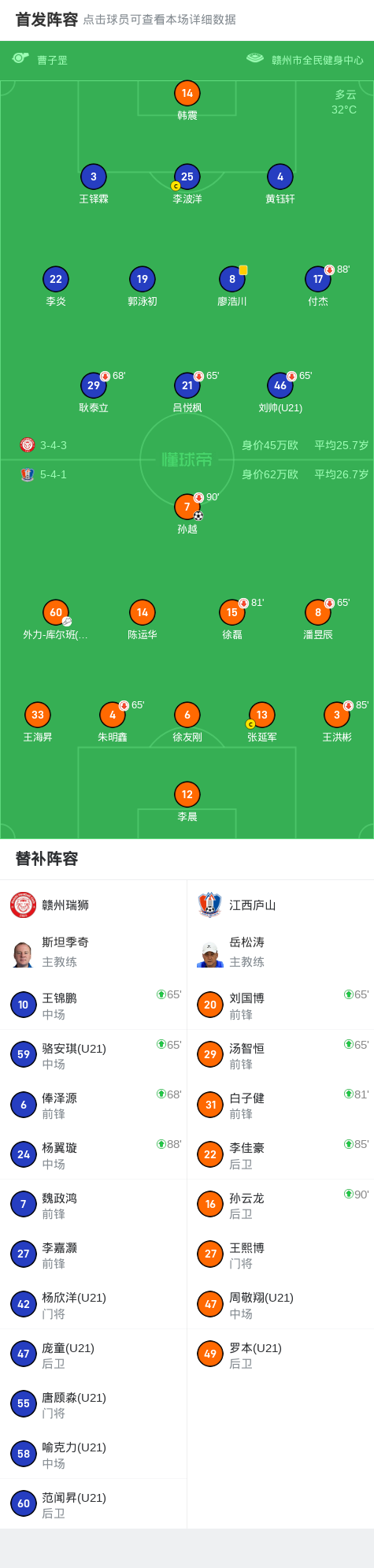 中国足球乙级联赛决赛阶段保级组第24轮,赣州瑞狮主场迎战江西庐山。比赛中,江西庐山凭借孙越的进球取得领先。下半场补时阶段,外力-库尔班送出助攻,孙越完成破门。最终,赣州瑞狮0-1不敌江西庐山。