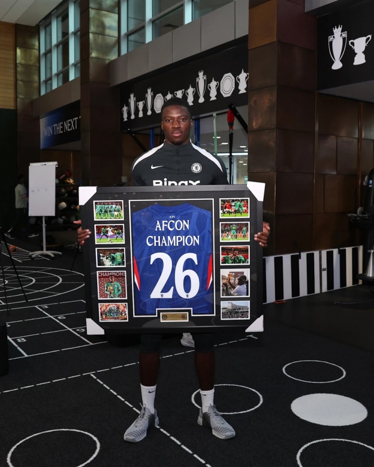 他的切尔西队友们迅速让他感受到回家的温暖,赠送给他一件装裱好的球衣,以庆祝他的非洲杯胜利。